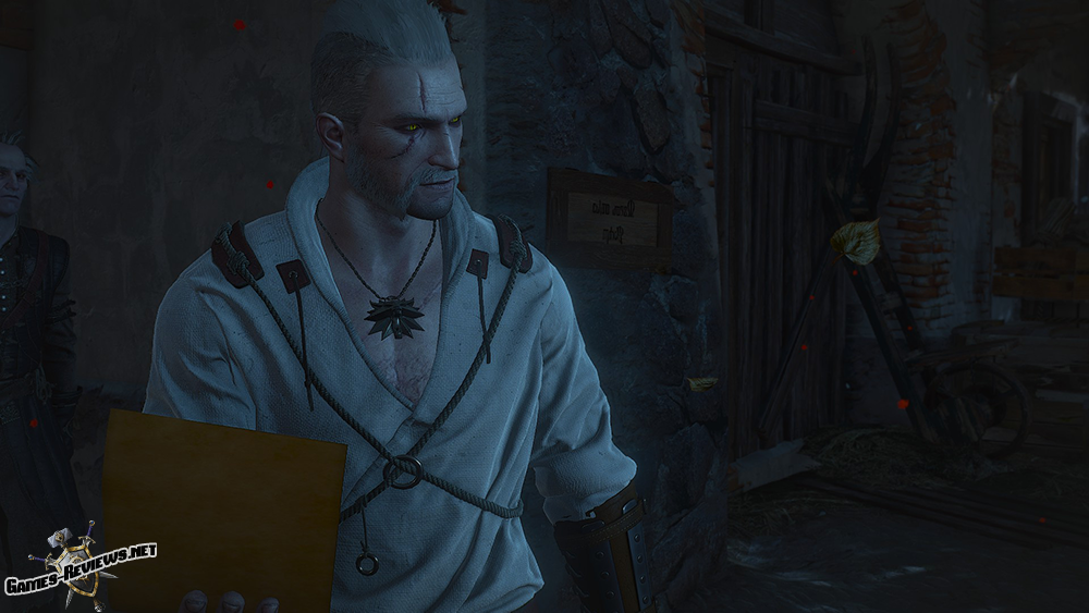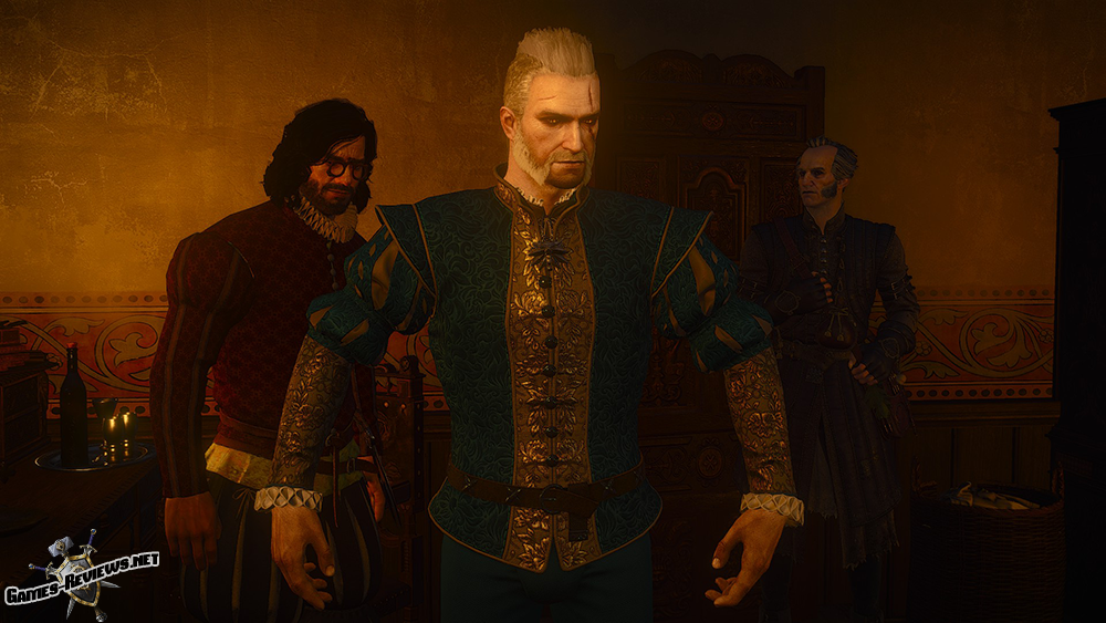 В начальной кат-сцене Геральт примеряет камзол и вяло переругивается с портным. Тот уверяет, что одежда пошита по последнему писку моды и сидит на ведьмаке идеально. Убийца чудовищ больше привык к броне и двум мечам на спине, поэтому чувствует себя немного глупо.