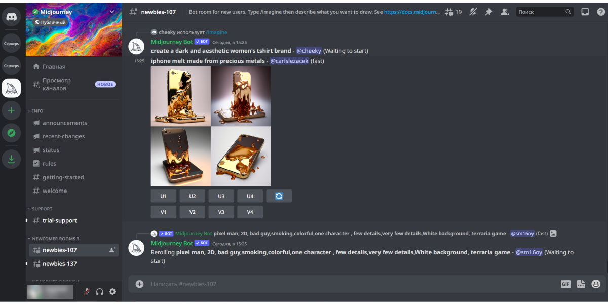 После того, как присоединитесь к Миджорни, вы получите доступ к общему чату, в котором сможете просмотреть запросы пользователей и другие сгенерированные изображения. Также здесь же будут отображаться и ваши картинки.