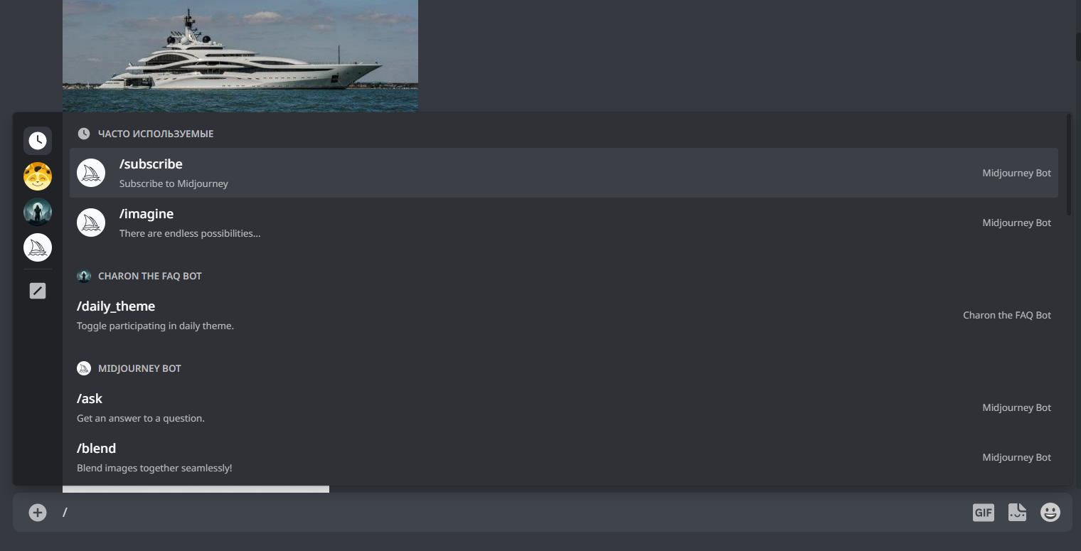 Кроме запросов, в нейросети Midjourney существуют базовые и дополнительные команды, которые влияют на результат. Чтобы увидеть список доступных команд, нужно ввести символ “/”.
