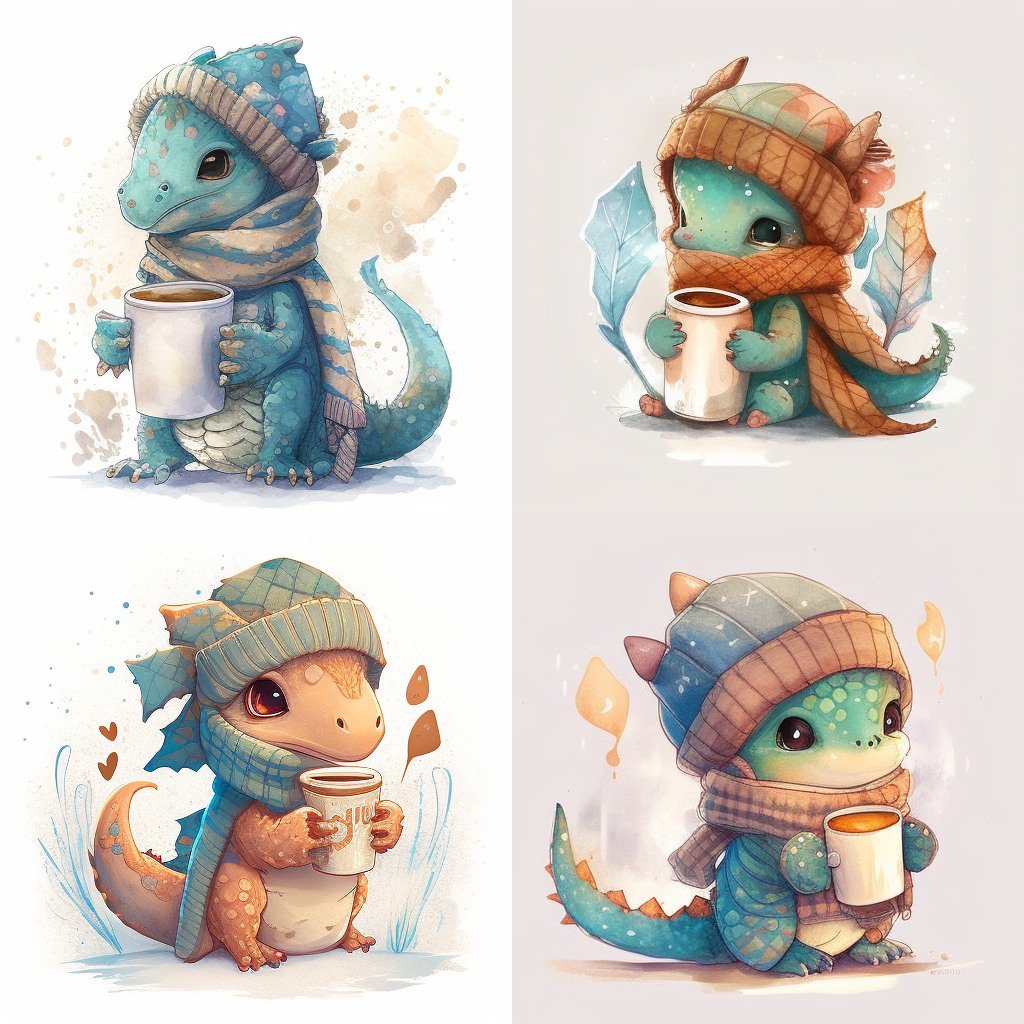 a cute adorable chibi style dragon in winter time wearing a winter hat and scarf and holding a mug of hot chocolate,winter vibes,illustration,painting,watercolor