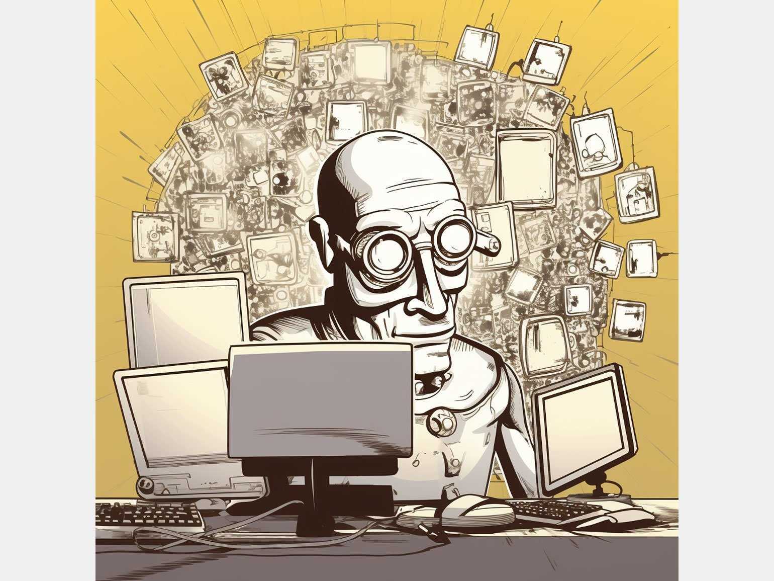Сюжет «Металлический робот с квадратной головой рисует картинки. В стиле комикса»Изображение: Midjourney / Skillbox Media