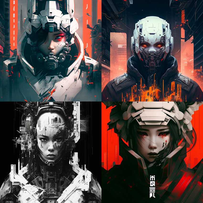 Large white border all round. Overlay Japanese type. A poster with a robot face on it, cyberpunk art by Maciej Kuciara, cgsociety, deconstructivism, darksynth, behance hd, dystopian art