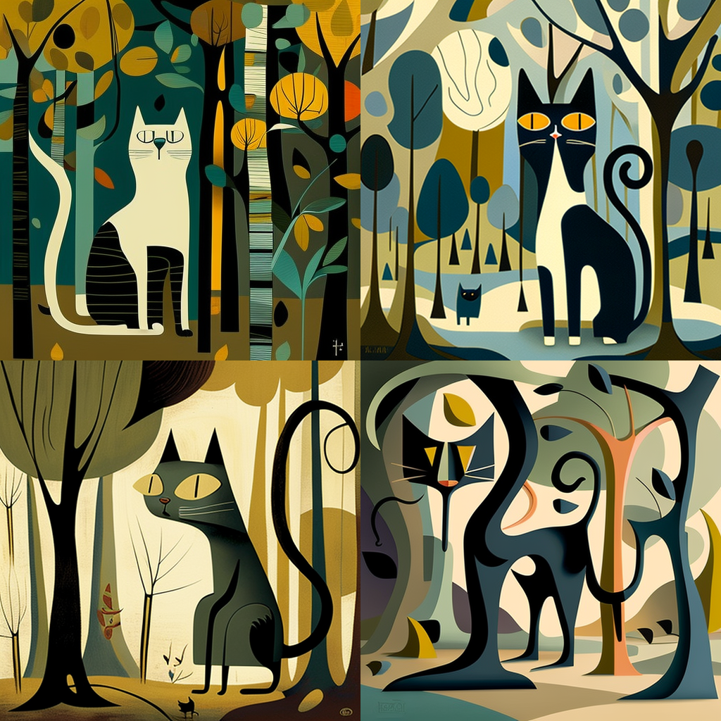 Gato en bosque pintado por dali con mezclas de miro al estilo charlie harper, optimista, bonito, y que se venda bien, fondo neutron