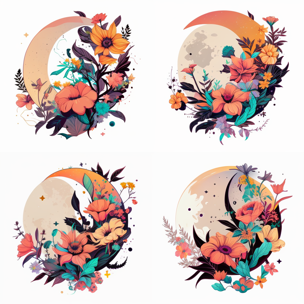 planet moon, month shape, with flowers, graphics, vector illustration, tattoo, abstract, pop art, minimalism, white background