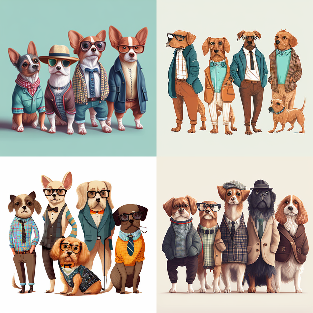 full body picture of group of dogs dressed with expensive preppy casual clothes, cartoon style