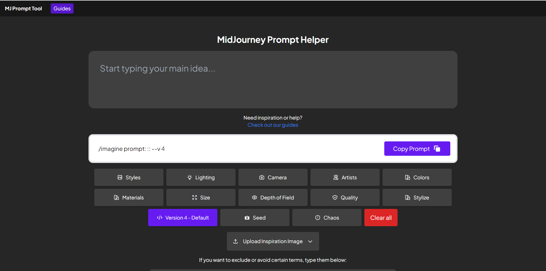 Работая с Midjourney, вебмастеру нужно знать функции и команды сервиса, чтобы установить корректный запрос. Однако, их составление занимает много времени. Поэтому, для удобства можно воспользоваться генератором подсказок AI. Они помогают в составлении запроса, но не генерируют изображения.