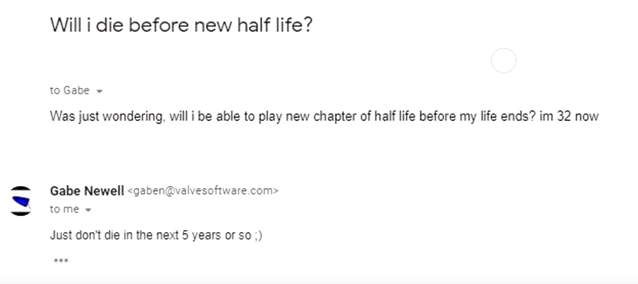 Об этом рассказал на новостном канале валв Valve News Network Тайлер Маквикер. В одной из своих рубрик он собирает многочисленные вопросы фанатов и оправляет их по электронной почте самому Гейбу, тот на них отвечает, после чего Тайлер вещает его ответы на публику. И вот недавно один из вопросов был: «Скажите, увижу ли я новый Half Life до того как умру? Сейчас мне 32». На что мистер Ньюэлл ответил фразой: «Не умирайте ближайшие пять лет или около того».