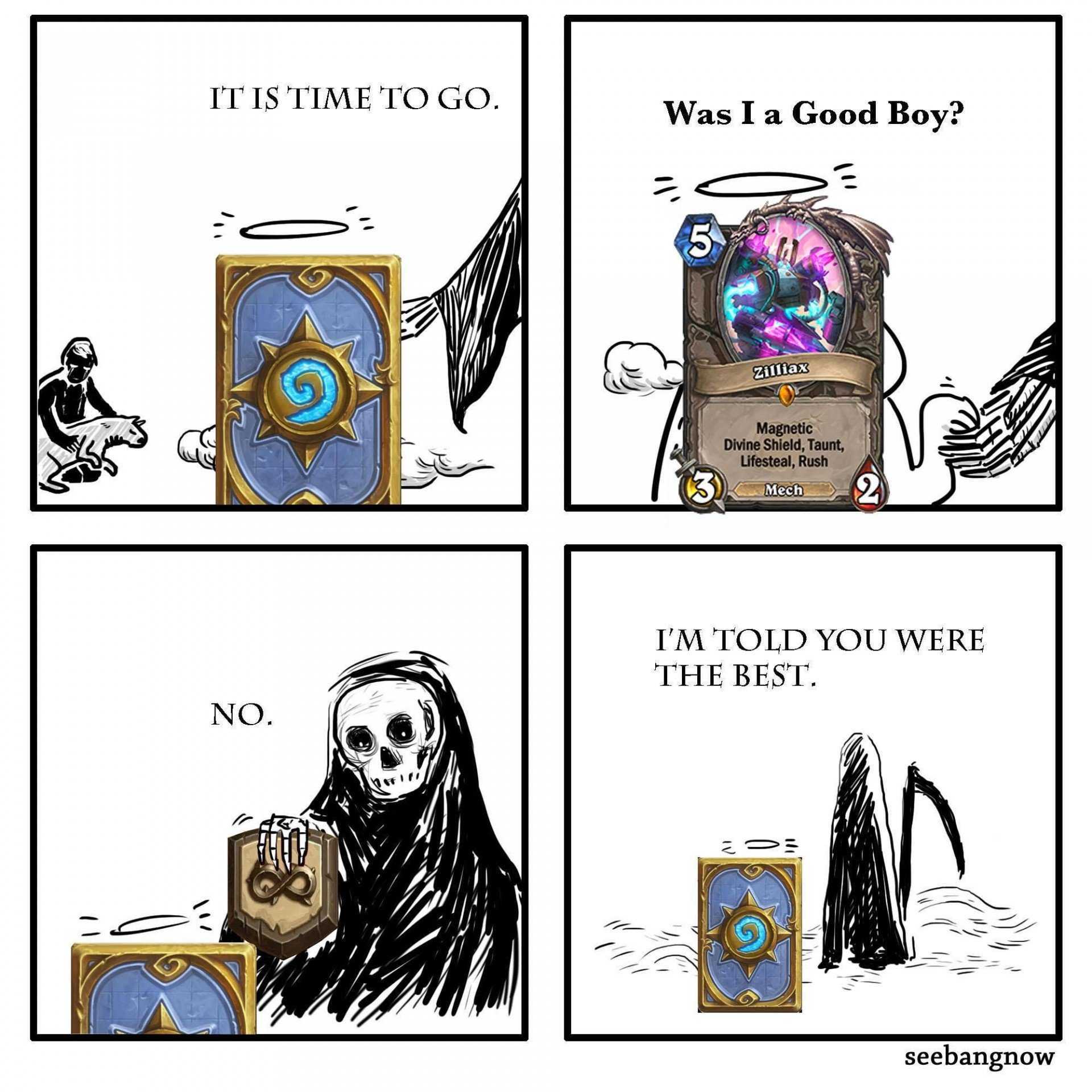 Приближается весна, а это значит, что в Hearthstone близится Новый Год, а с ним и перемены. По традиции в Новом Году три дополнения 2018 года уйдут в Вольный режим, в том числе и многие карты, к которым мы привыкли. Одной из таких потерь станет Зиллиакс. Эта карта не позволяла глупым агрессивным колодам доминировать в течение нескольких лет. Карта отлично подходила контроль-колодам, так как давала Провокацию, Похищение жизни и неплохие статы. Помянем Зиллиакса! Надпись на картинке: