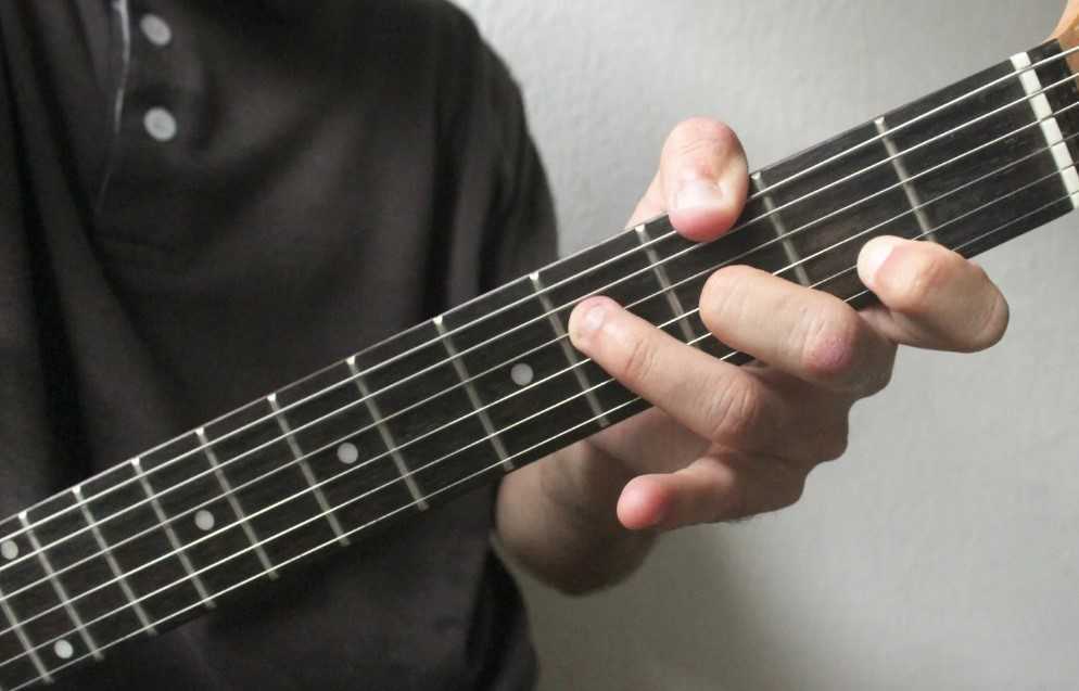 Обратите внимание: ни в коем случае большой палец не должен выглядывать над грифом. Существуют специальные приемы, при которых подобное возможно, однако они не для новичков