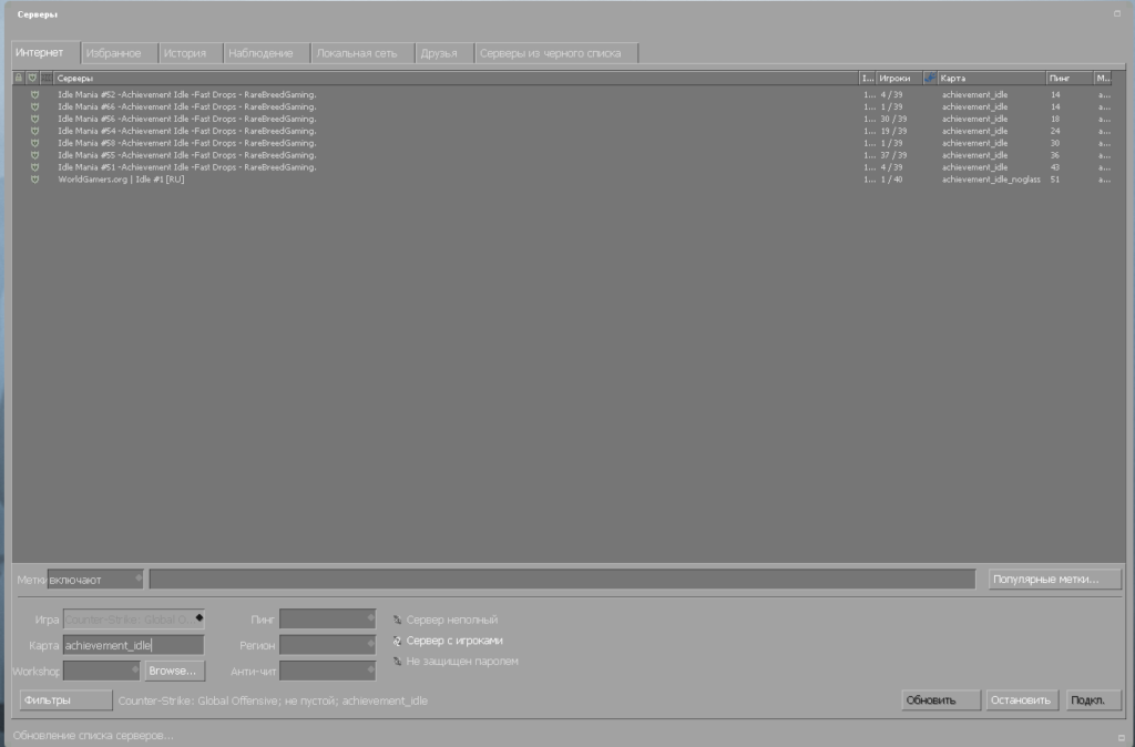 Открываете поиск серверов сообщества и пишите в поиске по картам achievement_idle