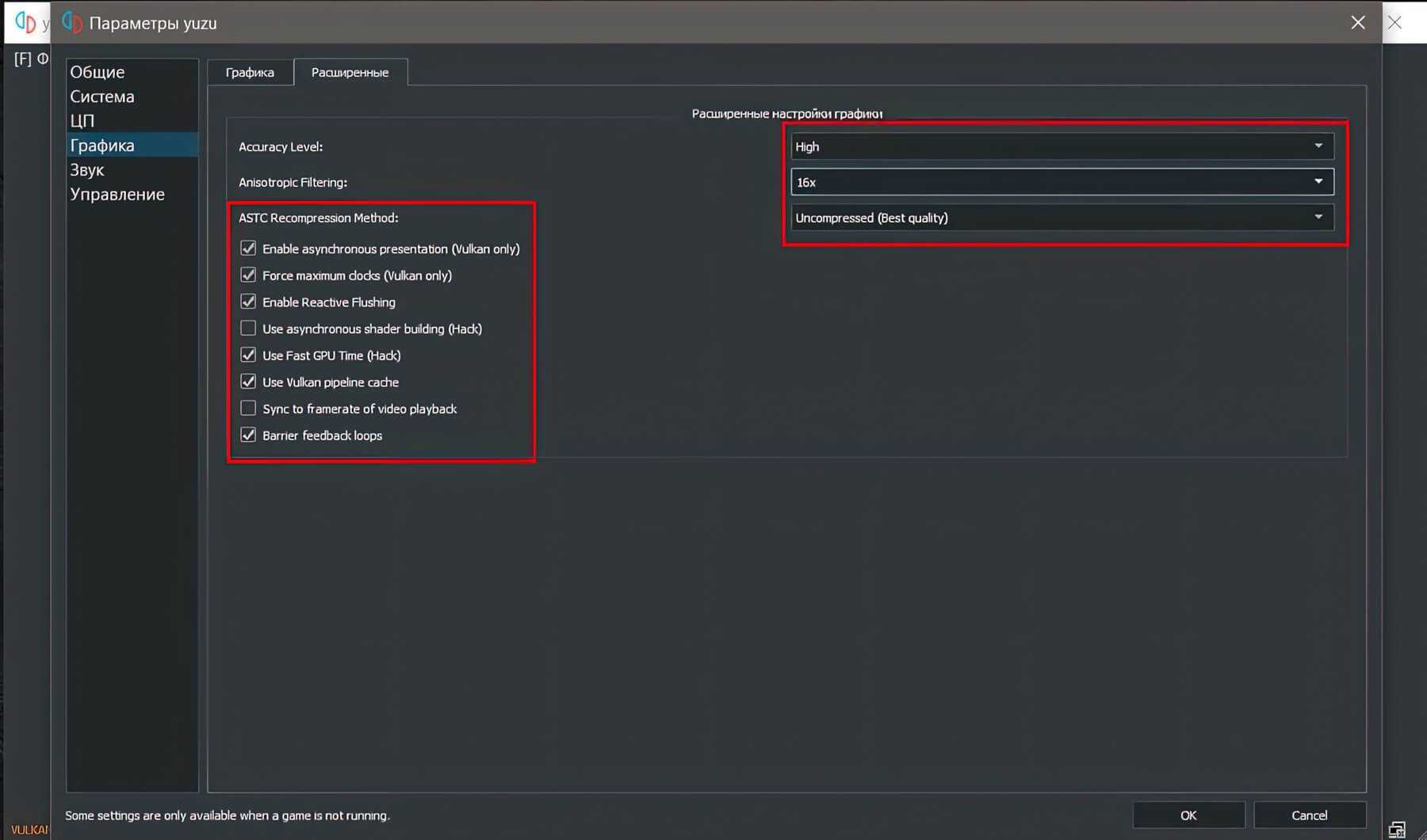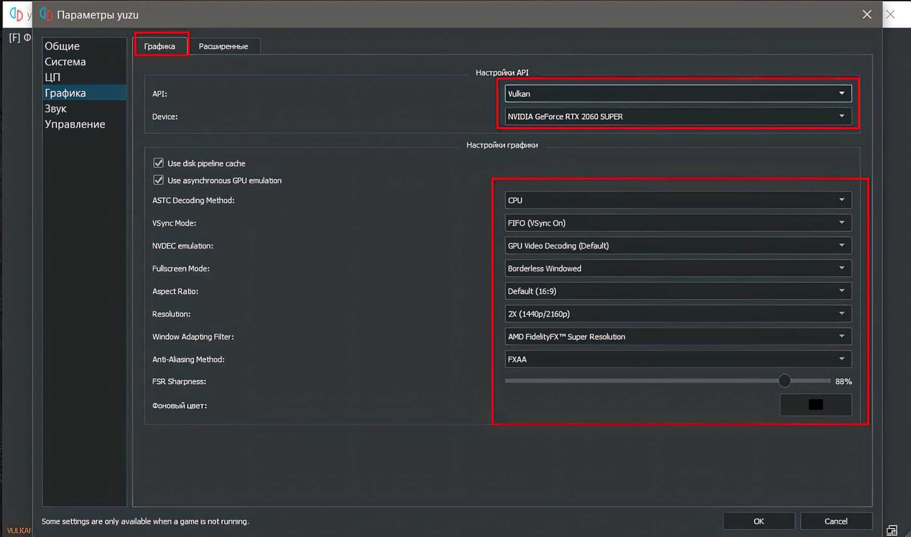 Мои настройки во вкладке графика, если ваша видеокарта поддерживает API Vulkan, выбирайте его, в других ситуациях указывайте OpenGL.