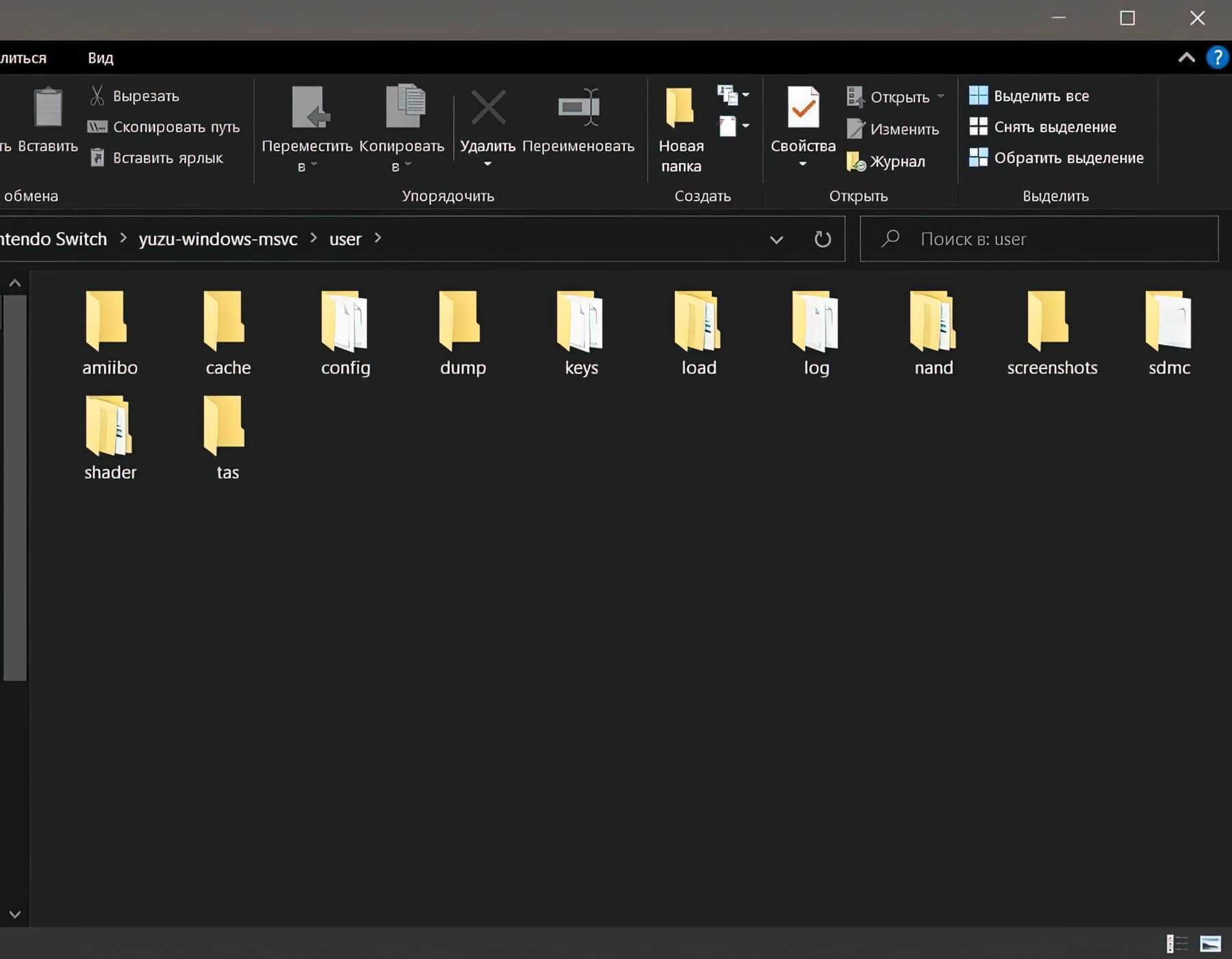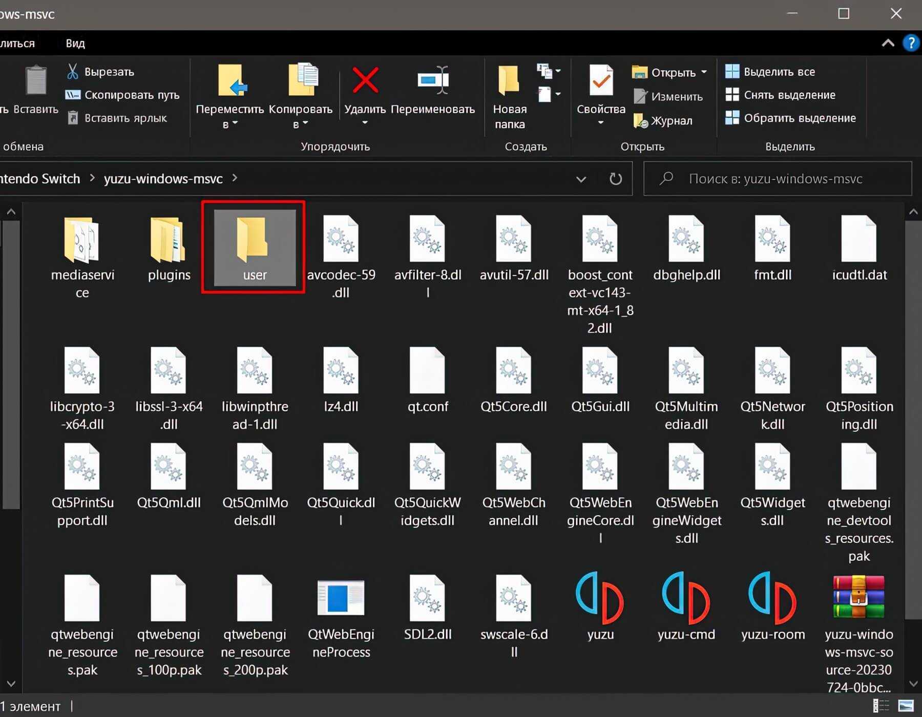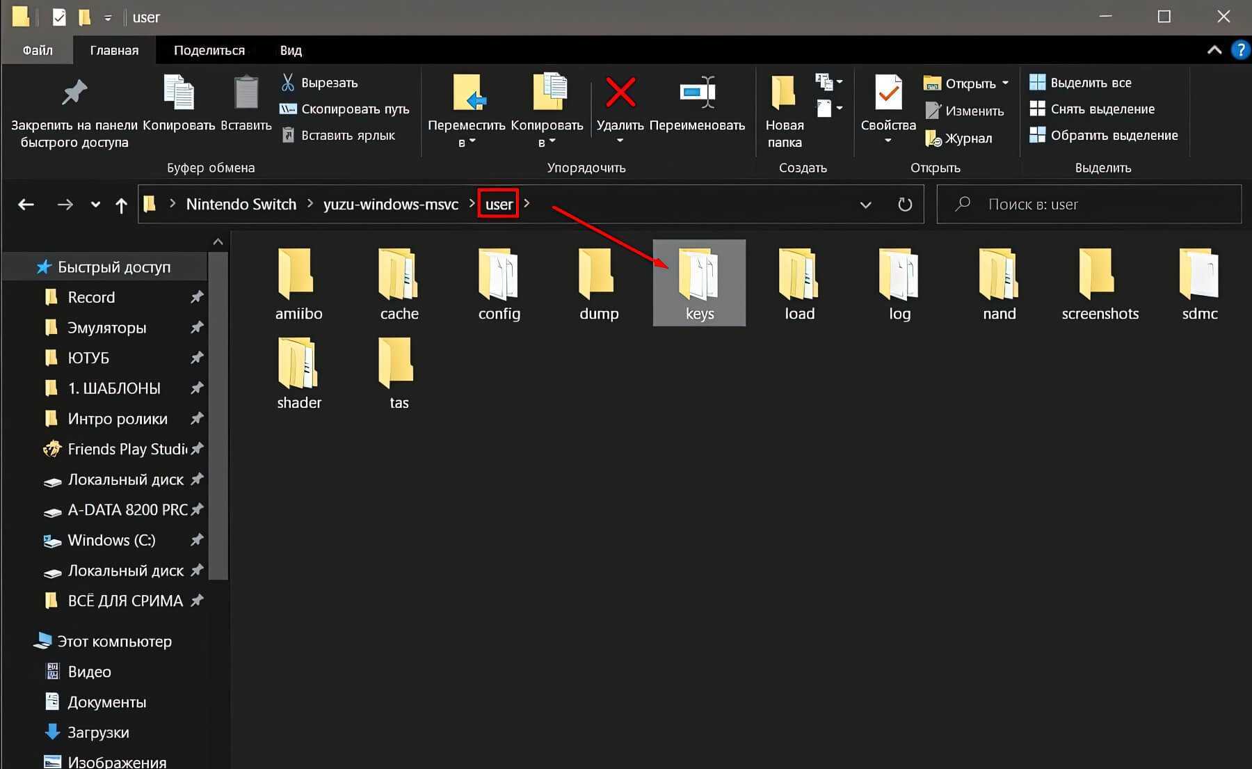 Если вы не создавали в папке с эмулятором папку user, то попасть в корневую папку с настройками эмулятора можно через сам эмулятор. Запустите эмулятор, выберите в верхнем меню Файл—>Открыть папку yuzu. После чего можете скопировать файлы ключей в папку keys