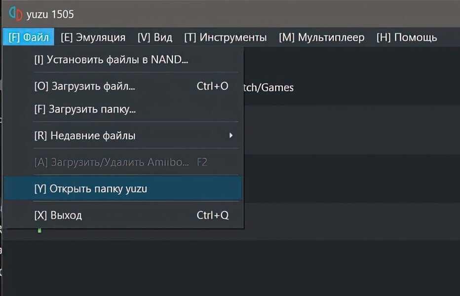 - Выберите на верхней панели Yuzu пункт «Файл». В выпадающем окне нажимайте на «Открыть папку Yuzu» — она откроет внутренние файлы эмулятора;